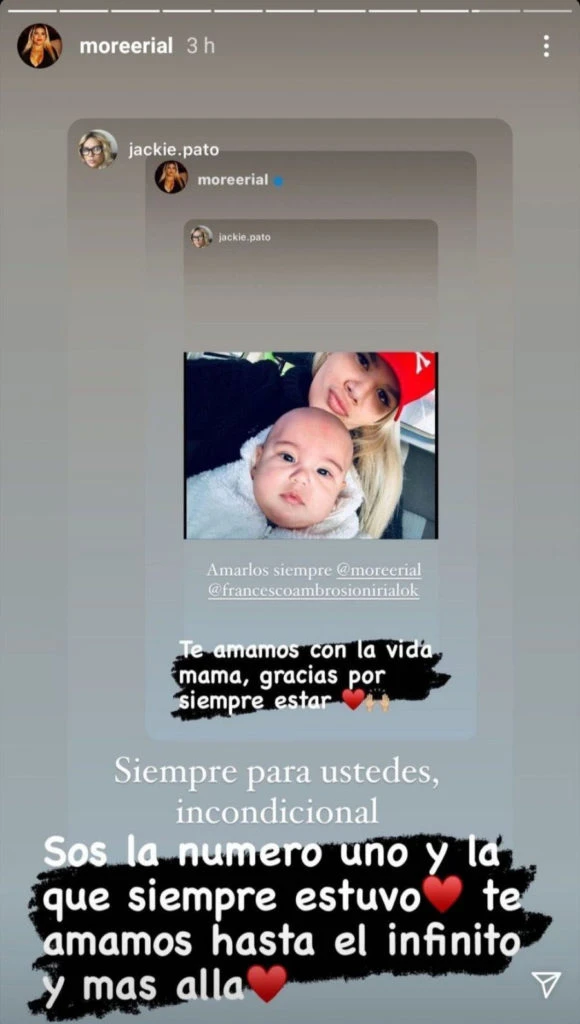 “Te amo mucha mamita linda, gracias por tu amor incondicional, sos la mujer más linda y buena que conozco, te amo más de lo que te imaginas”, publicó la mamá de Francesco. Una declaración impresionante, que alimenta las suspicacias, aunque lo concreto es que Jacki se erige en un sostén, en una persona imprescindible para Morena.