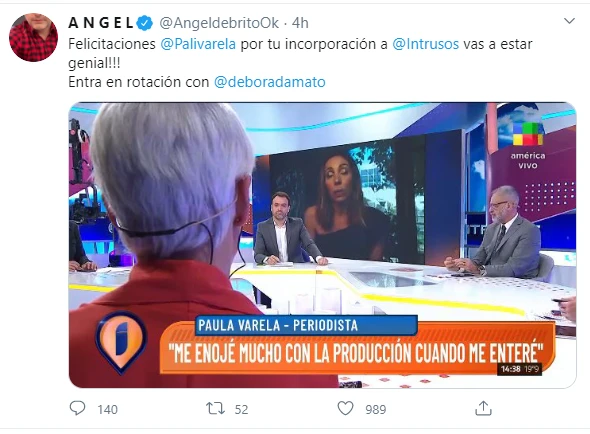 “Felicitaciones Paula Varela por tu incorporación a Intrusos”, escribió De Brito en su cuenta de Twitter y agregó: "¡¡¡Vas a estar genial!!! Entra en rotación con Débora D’Amato”.