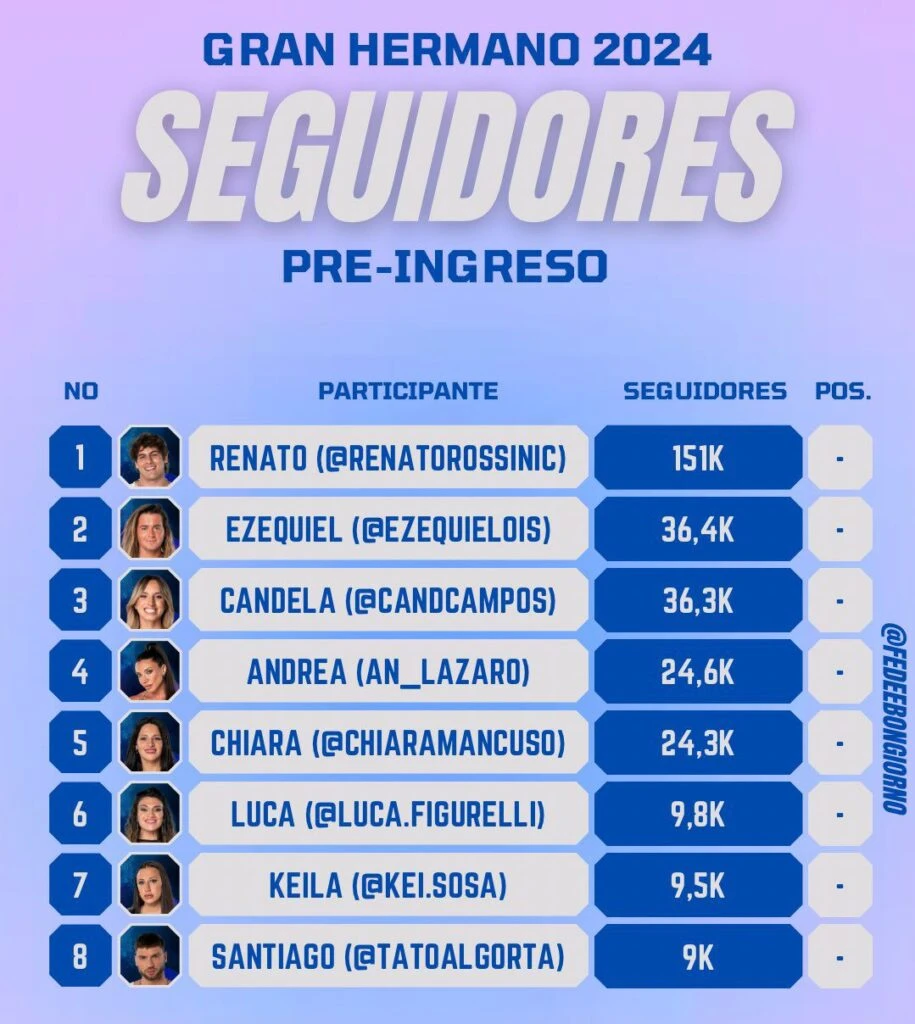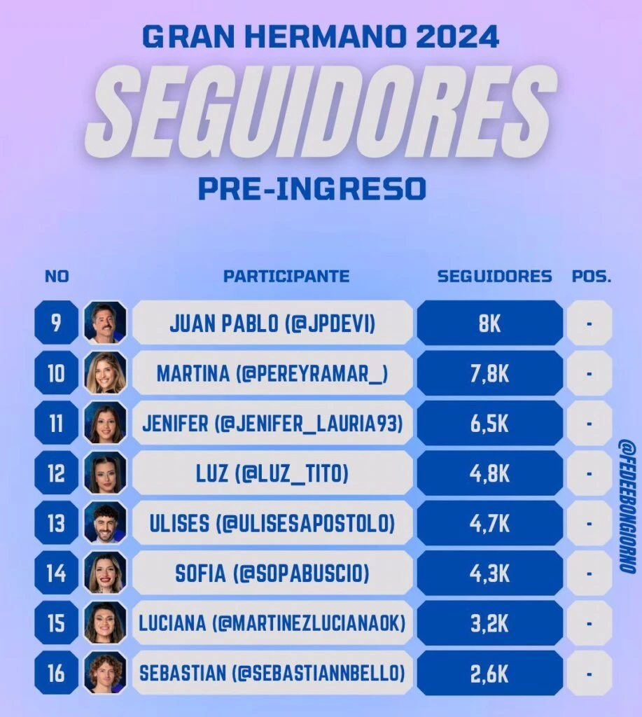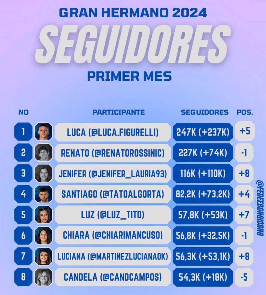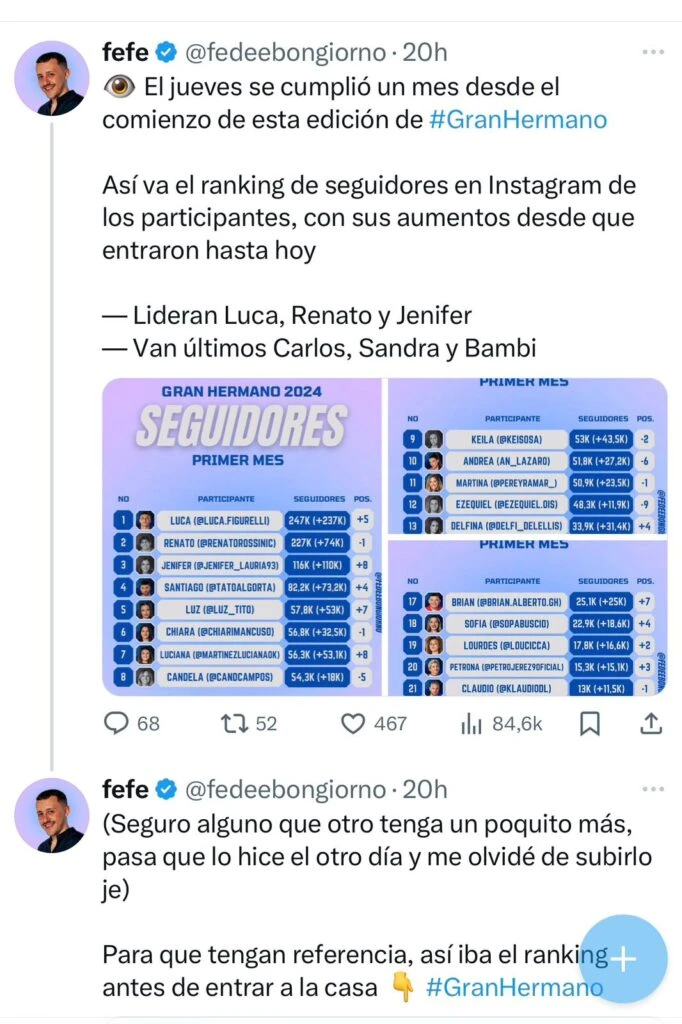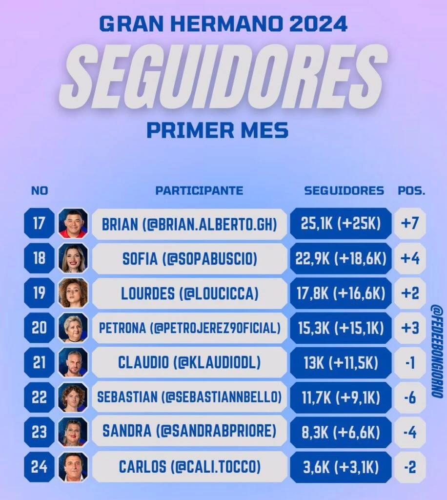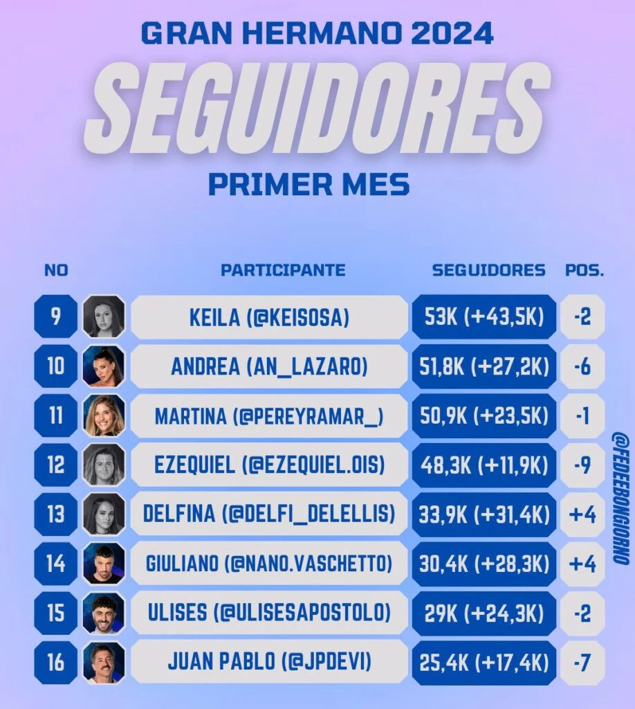 “El jueves 2 de enero se cumplió un mes desde el comienzo de esta edición de #GranHermano. Así va el ranking de seguidores en Instagram de los participantes, con sus aumentos desde que entraron hasta hoy”, escribió en su cuenta personal de la X el columnista de LAM.