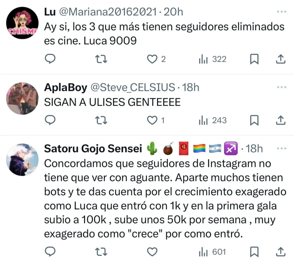Ante la publicación de Bomgiorno los seguidores de Twitter comenzaron a opinar al respecto y dejaron comentarios tales como: “Ay si, los 3 que más tienen seguidores eliminados es cine. Luca 9009”, “Sigan a Ulises”, “Concordamos que seguidores de Instagram no tiene que ver con aguante. Aparte muchos tienen bots y te das cuenta por el crecimiento exagerado”.