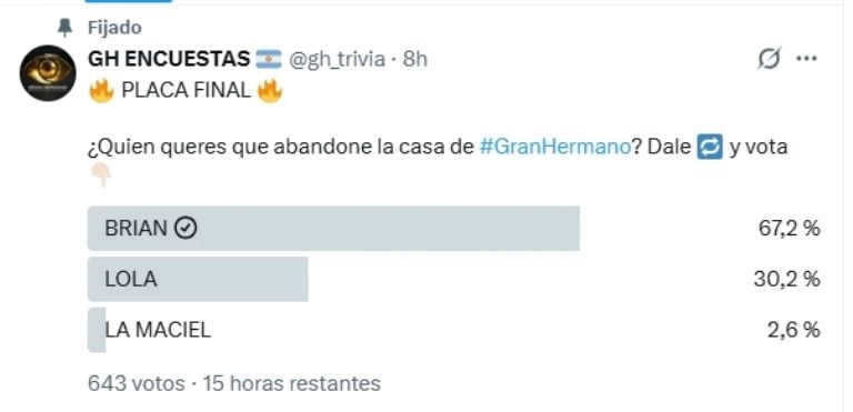 Si bien estos datos no son oficiales, lo cierto es que en más de una ocasión las encuestas anticiparon correctamente el resultado final, lo que genera aún más expectativa de cara a la gala de eliminación de este lunes. La situación de Brian no sorprende del todo. En los últimos días, su juego quedó en el centro de la escena y generó opiniones divididas tanto dentro como fuera de la casa.