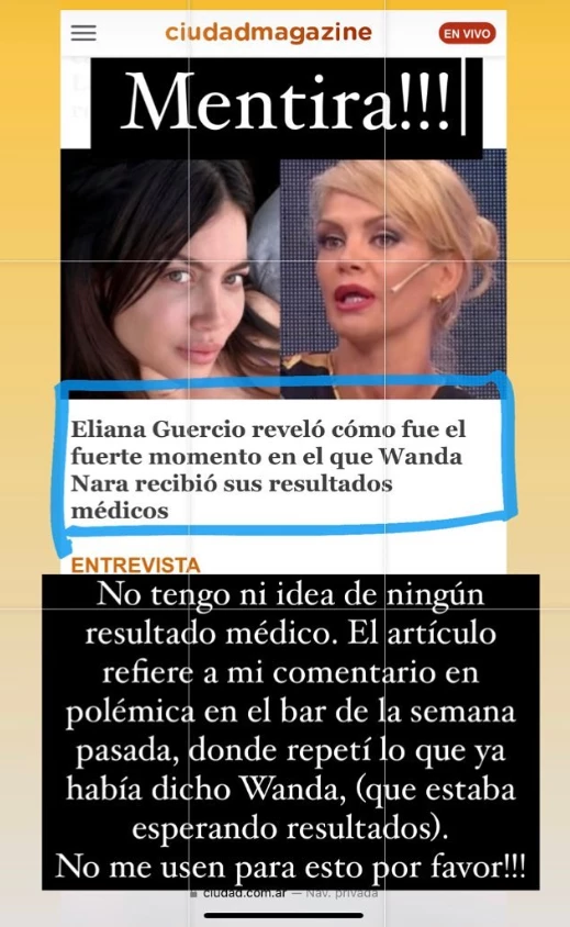 Indignada con las notas que se publicaron a raíz de sus declaraciones, Eliana compartió en sus redes uno de los artículos titulado "Eliana Guercio reveló cómo fue el fuerte momento en el que Wanda Nara recibió sus resultados médicos", y lanzó un fuerte pedido.