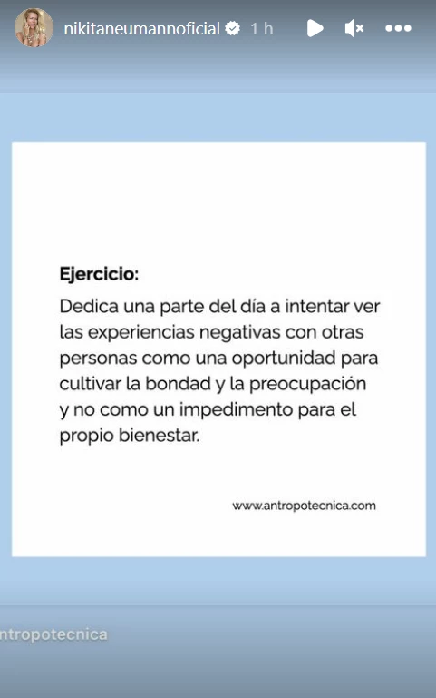 Luego, la pareja de Manu Urcera siguió con un ejercicio de autoayuda: “Dedicate una parte del día a intentar ver las experiencias negativas con otras personas como una oportunidad para cultivar la bondad y la preocupación y no como un impedimento para el propio bienestar”.