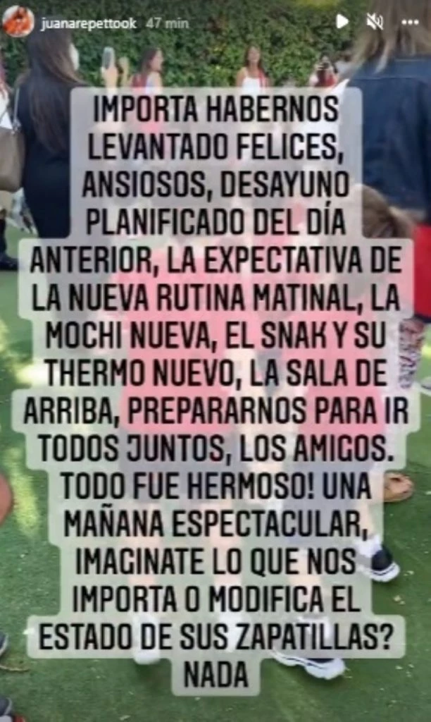 Acto seguido, y siempre contundente, agregó "No me parece grave. En esta casa importan otras cpsas. Importa habernos levantado felices, ansiosos, con expectativa por la nueva rutina matinal, la mochi nueva, la sala de arriba, prepararnos para ir todos juntos, los amigos... fue todo hermoso, una mañana espectacular... imaginate lo que importa o modifica el estado de las zapatillas. Nada".