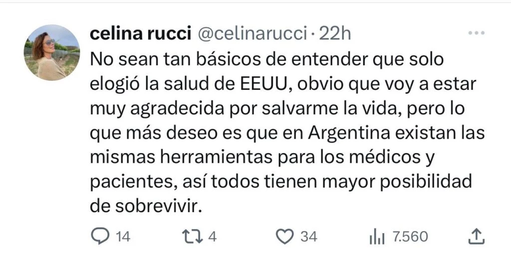 Al ser repudiada por sus comentarios, Rucci salió al cruce y reaccionó: “No sean tan básicos de entender que solo elogio la salud de Estados Unidos. Obvio que voy a estar muy agradecida por salvarme la vida, pero lo que más deseo es que en Argentina existan las mismas herramientas para los médicos y pacientes. Así todos tienen mayores posibilidades de sobrevivir”.