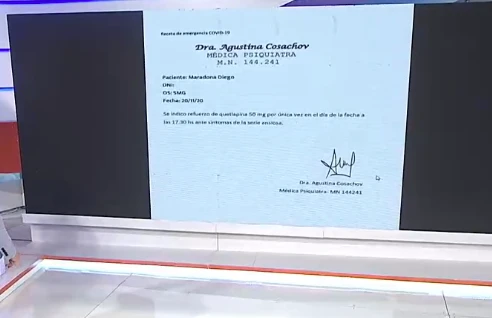 Hasta que en un momento exhibieron otra receta, muy peculiar, que refiere a un refuerzo especial de un día determinado para Diego. “Hay una segunda hoja de estas recetas, también con el recetario de la psiquiatra, se indicó refuerzo de Quetiapina por única vez, por esta fecha, el 20 de noviembre. Osea 5 días antes de la muerte. Le refuerza porque tiene síntomas de serie ansiosa”, contó Lussich.