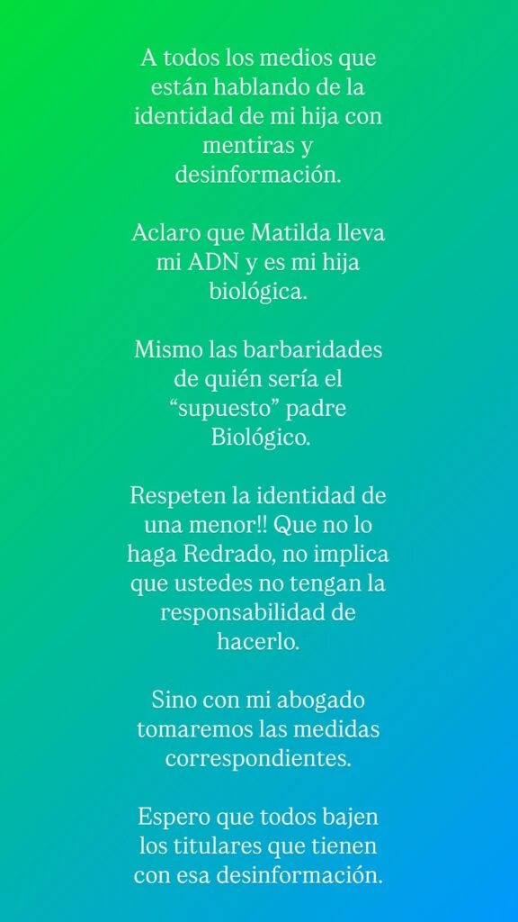 “Aclaro que mi hija Matilda lleva mi ADN y es mi hija biológica”, estalló Salazar en sus historias de IG el mediodía del 2 de abril, indignada luego de ver los titulares en varios portales anunciando que se había “filtrado” el nombre de la presunta “madre biológica” de su pequeña.