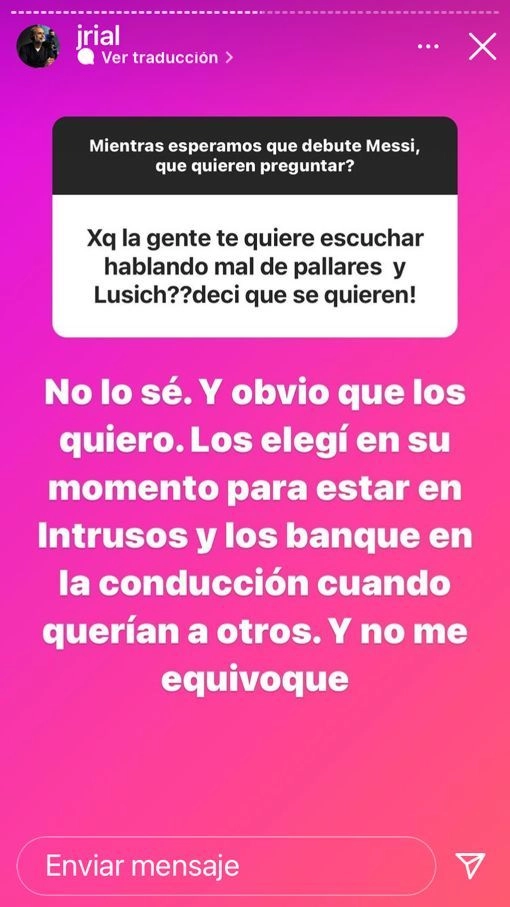 Dentro de ese contexto, un usuario decidió consultarle por su relación con los actuales conductores del programa de espectáculos y le preguntó por qué en los diversos medios se habla de un mal vínculo entre ellos: “¿Por qué la gente te quiere escuchar hablando de Pallares y Lussich? Decí que se quieren”.