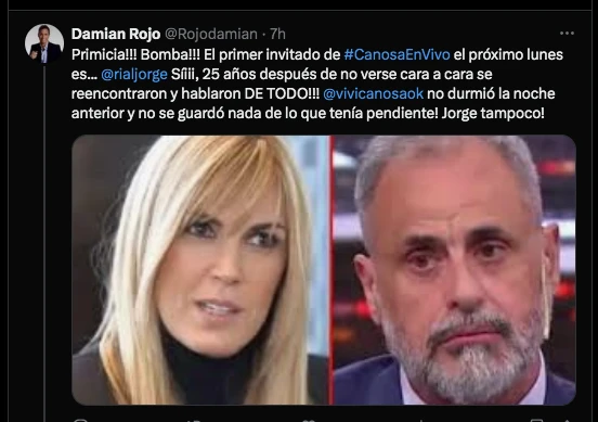 La novedad la esparció Damián Rojo, que agarró su Twitter y narró esta sorpresiva decisión de Canosa: “¡Primicia! ¡Bomba! El primer invitado de #CanosaEnVivo el próximo lunes es... Jorge Rial. Sí, 25 años después de no verse cara a cara se reencontraron”.