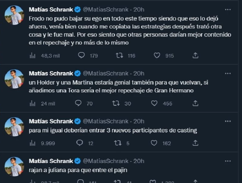 “Rajan a Juliana para que entre el pajin”, escribió haciendo referencia a Agustín. Ante esto, muchos comenzaron a preguntarse por qué, que en todo caso debería ser la de Moreno la que entre, ya que fue la segunda que más votos recibió. Sobre esto nunca explicó de dónde sacó la información o si solo se trataba de un pensamiento suyo.