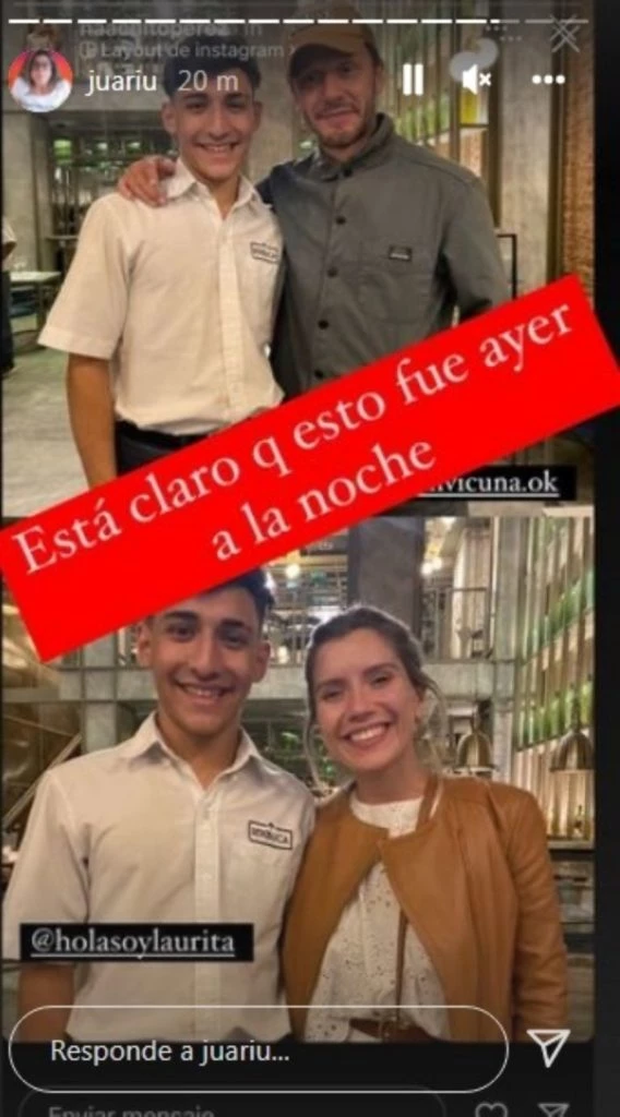 "Cara de… al fin tomé (vino) mendocino", puso en sus historias Juariu, pero luego, agregó: "Y veo si es que hay canje de vino o algo pero no veo nada. Me pongo a buscar porque huelo algo y me pongo a ver las historias del restaurante".