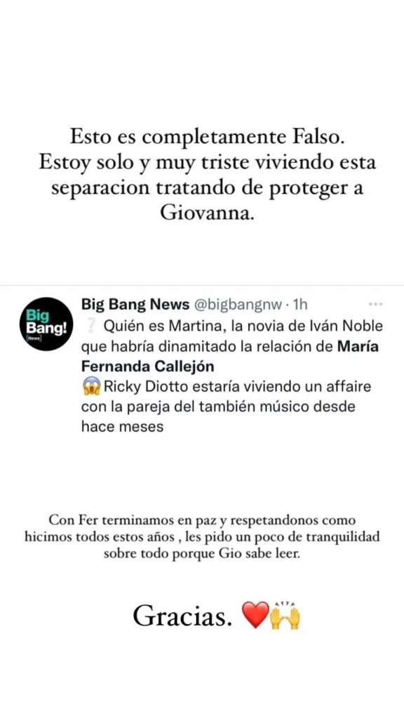 Asimismo, agregó: “Con Fer terminamos en paz y respetándonos como hicimos todos estos años. Les pido un poco de tranquilidad sobre todo porque Gio sabe leer. Gracias". Además, en otra historia Ricky volvió a subir el texto que publicó tras la confirmación de la separación y acotó: "Por si no quedó claro...".