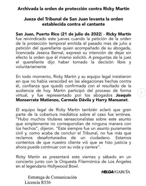 Y el jueves 21 de julio, tal como confirmó la representante de Ricky, el Tribunal de Primera Instancia de San Juan archivó el caso. Helga García aseguró que en las próximas horas darán una conferencia de prensa junto al equipo legal para dar más detalles sobre la decisión judicial.