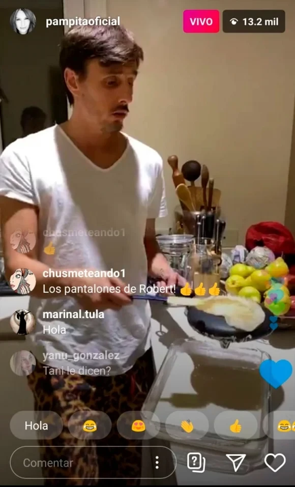Todo iba muy bien, los chicos degustaron y aprobaron los panqueques pero los usuarios que estaban en el vivo no dejaron pasar un detalle en el look de García Moritán: su pantalón de pijama animal print.