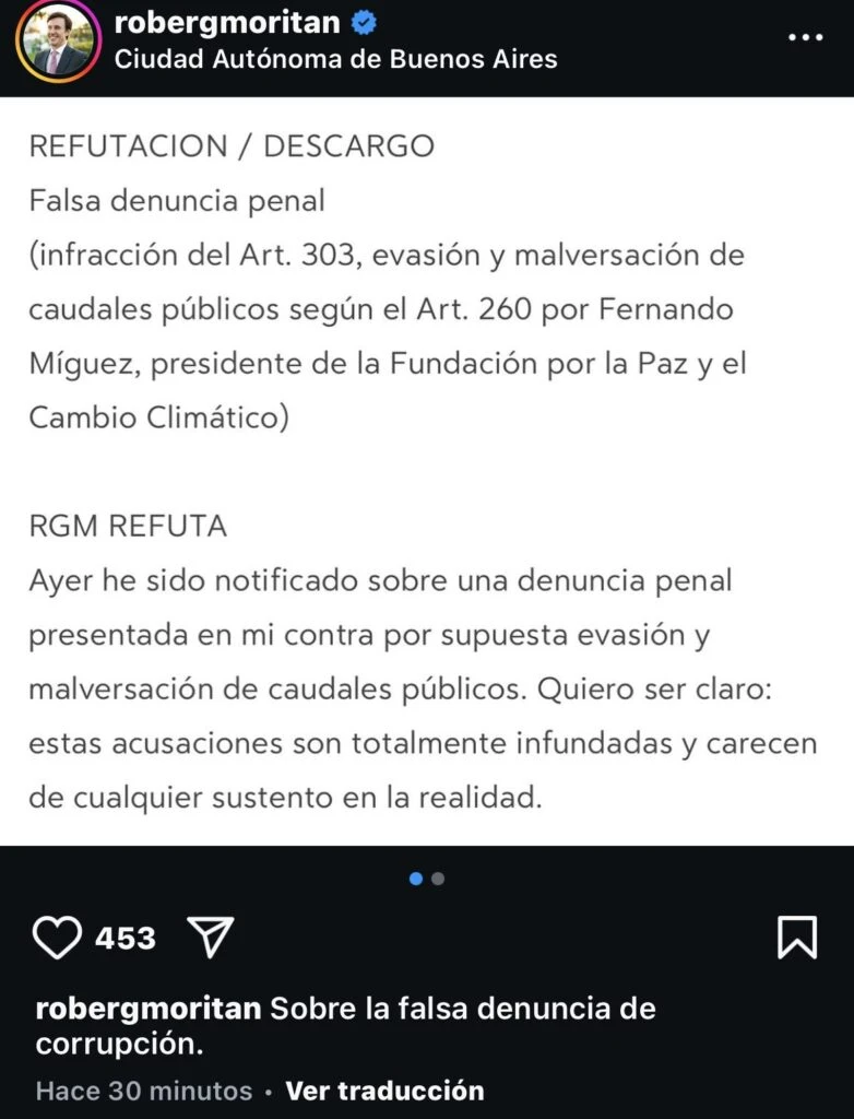 “Falsa denuncia penal (infracción del Art. 303, evasión y malversación de caudales públicos según el Art. 260 por Fernando Míguez, presidente de la Fundación por la Paz y el Cambio Climático) Ayer he sido notificado sobre una denuncia penal presentada en mi contra por supuesta evasión y malversación de caudales públicos. Quiero ser claro: estas acusaciones son totalmente infundadas y carecen de cualquier sustento en la realidad”, finalizó.