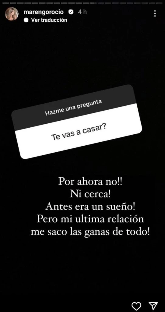 De ese modo se activaron las alarmas para rascar en el fondo de la cuestión y ahora surgieron datos tremendos, que emanó la propia Marengo. Resulta que en su cuenta de Instagram jugó con sus seguidores a un feedback y ahí llegaron preguntas concisas y picantes.