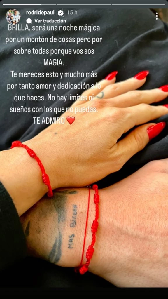 Para calmar las aguas, el jugador subió a sus historias de Instagram una foto dedicada a la cantante. "BRILLÁ, será una noche mágica por un montón de cosas pero por sobre todas por que vos sos MAGIA", de esa manera empezaba el tierno mensaje del jugador a su novia.