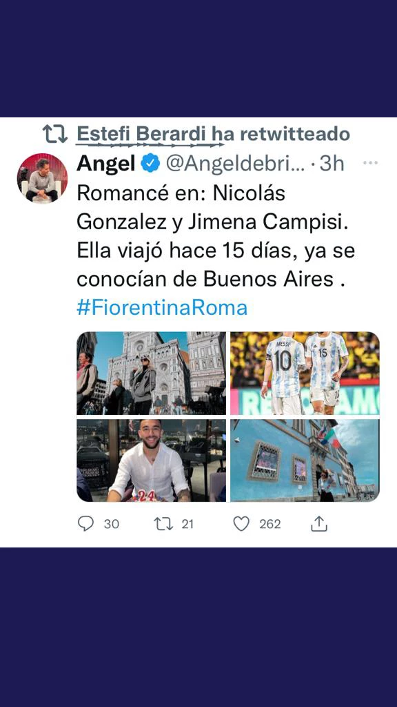 El conductor de LAM escribió: “Romance Florencia : Nicolás Gonzalez y Jimena Campisi. Ella viajó hace 15 días, ya se conocían de Buenos Aires” . Un tuit que se viralizó con fuerza por las plataformas digitales, por la trascendencia del jugador y la visibilidad de la famosa.