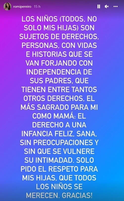 A través de una storie, Romina exclamó: "Los niños (todos, no sólo mis hijas) son sujetos de derechos, personas con vidas e historias que se van forjando con independencia de sus padres, que tienen otros tantos derechos".
