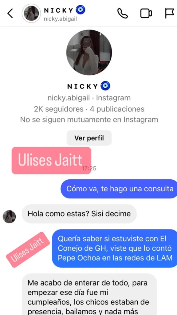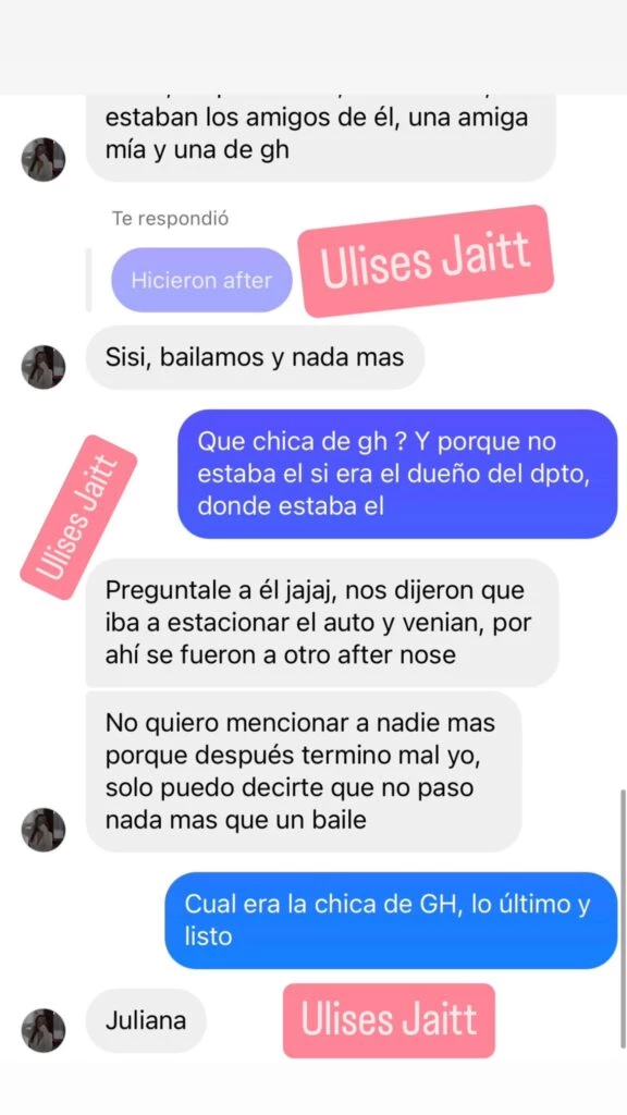Nicky le respondió, pero aseguró no saber nada más, que le pregunte a él: "Preguntale a él jajaj, nos dijeron que iba a estacionar el auto y venian, por ahí se fueron a otro after nose. No quiero mencionar a nadie mas porque después termino mal yo, solo puedo decirte que no paso nada mas que un baile". Para cerrar Ulises le preguntó: "Cuál era la chica de GH, lo último y listo". "Juliana", fue la respuesta que puso fin al tema.
