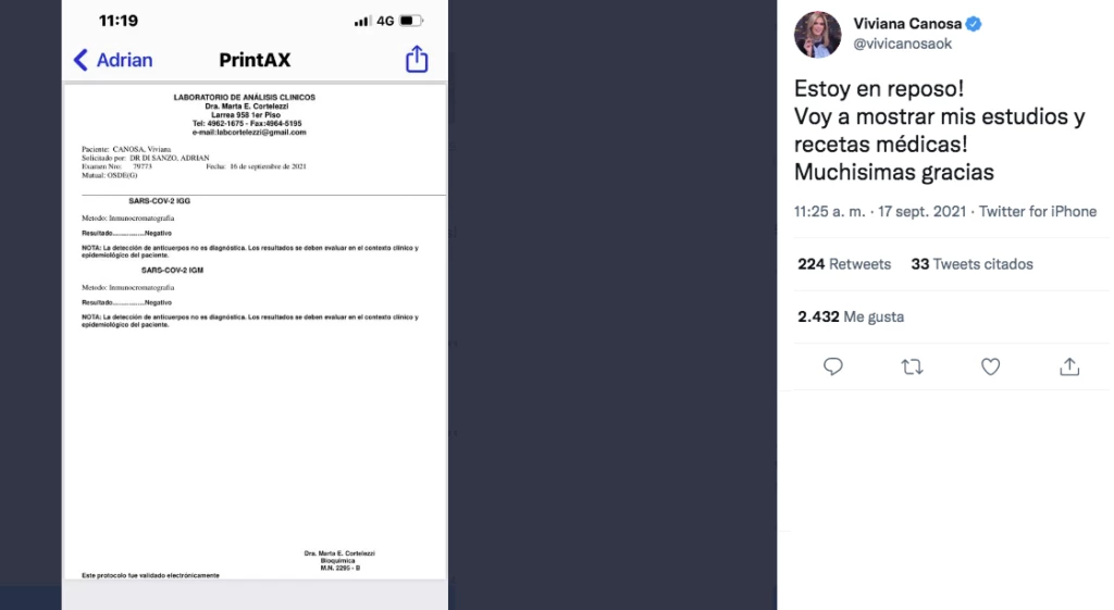 “¡Estoy en reposo! ¡Voy a mostrar mis estudios y recetas médicas! Muchísimas gracias”, fueron las palabras de Canosa en su perfil de Twitter, en donde sumó el informe que determinaba que era no detectable de coronavirus.