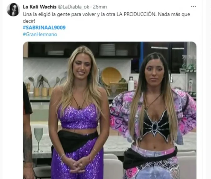 Sabrina generó todo tipo de reacciones en X, muchas de ellas manifestando que la jugadora había vuelto al reality show porque "está acomodada". "Sabrina agradeciendo a la gente que la volvió a meter en la casa. No te votó nadie reina, estás acomodada", "Cata entró primera con el voto de repechaje. Sabrina volvió a entrar sólo por el Golden Ticket. ¿De verdad me van a hacer creer que hay más gente que banca a la acomodada de Sabrina?".