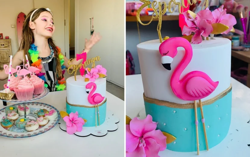 A pesar de que los invitados sólo eran sus papás y su hermano, Esperanza tuvo una mesa dulce con cupcakes, galletas, donas y una super torta de flamencos y flores.
