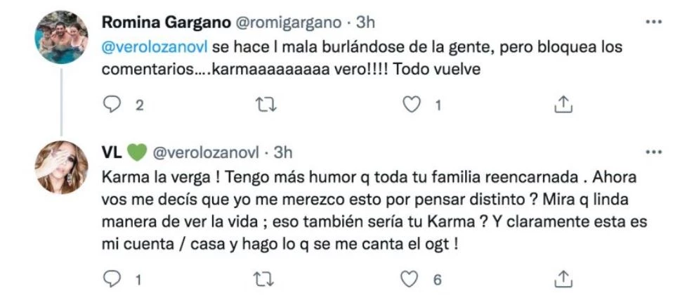 Pero Vero no se quedó en el molde y le respondió furiosa. "¡Karma la verga! Tengo más humor que toda tu familia reencarnada", arrancó, y siguió furiosa: “Ahora, ¿vos me decís que yo me merezco esto por pensar distinto? Mirá qué linda manera de ver la vida; ¿eso también sería tu karma?”.