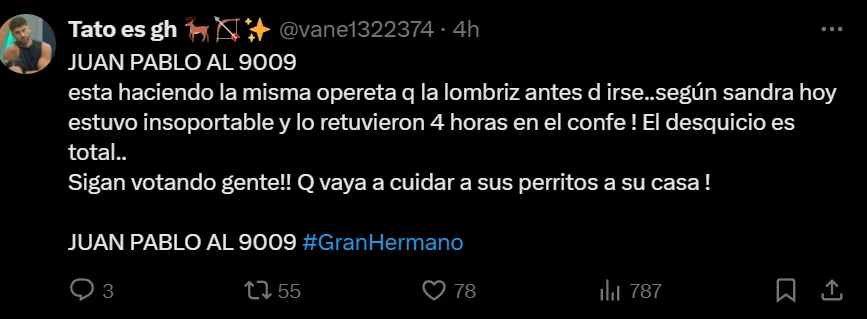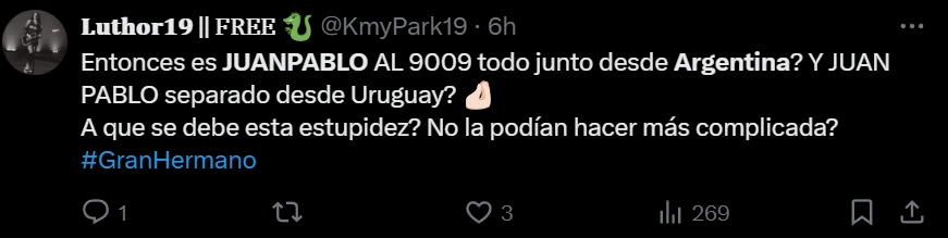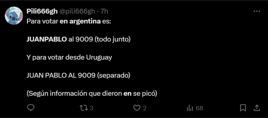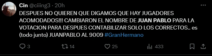Pero los fanáticos del Tridente descubrieron que la única manera de que computen los votos es enviar "JuanPablo" todo junto. Por supuesto que las redes sociales estallaron contra el canal, Santiago del Moro y la producción del ciclo de Telefe.