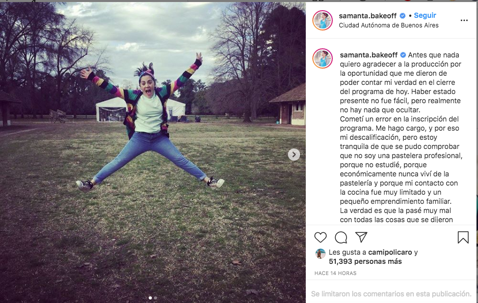 El comunicado de las autoridades explicó: “Por los hechos de público conocimiento, al comprobarse la experiencia laboral y televisiva de #SamantaBakeOff, la cual fue negada en el formulario, y con el fin de garantizar la transparencia de #BakeOffArgentina el jurado decide descalificarla de la competencia”.