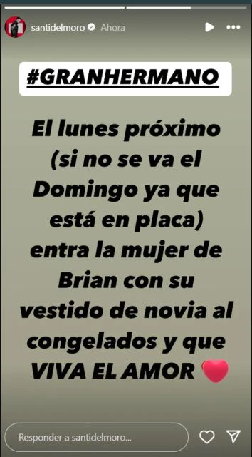 Santiago del Moro contó en su Instagram que el próximo lunes 27 de enero pasará algo muy especial en Gran Hermano. La mujer de Brian Alberto va a entrar al Congelados para pedirle matrimonio en vivo, con vestido de novia incluido.