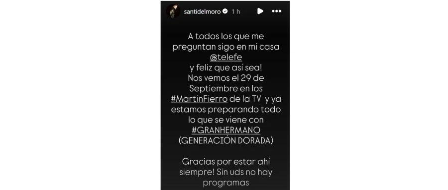 “Nos vemos el 29 de septiembre en los Martín Fierro de la televisión y ya estamos preparando todo lo que se viene con Gran Hermano (Generación Dorada)”, señaló, confirmando que su vínculo con el canal se mantiene más fuerte que nunca.