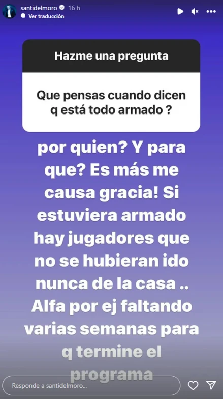 Lo cierto es que Santiago del Moro se hartó de las especulaciones y salió a defender al ciclo que conduce al responder a través de sus historias de Instagram a un seguidor que le preguntó: “¿Qué pensás cuándo dicen que está todo armado?”.