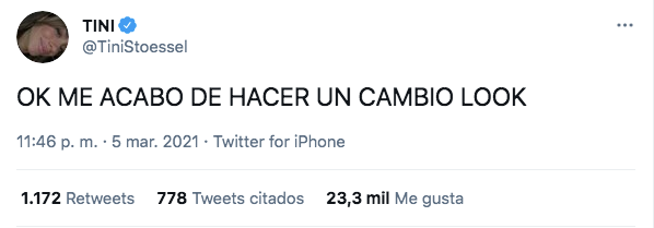 No obstante, a pesar de no mostrarlo ella misma, Tini anticipó que había decidido dejar su pelo en manos de sus estilistas de confianza, e instalada en Argentina nuevamente tras unas largas semanas en Los Ángeles para continuar con sus proyectos musicales, escribió en Twitter lo que había hecho: “Ok. Me acabo de hacer un cambio de look”.