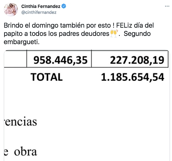 Utilizando su cuenta de Twitter, Fernández publicó una captura de pantalla del monto adeudado por su exmarido, y celebró la nueva decisión de la Justicia de retribuirle ese dinero a ella, claro está, para sus tres chicas. Dicho documento, rezaba la suma de $1.185.654,54.-
