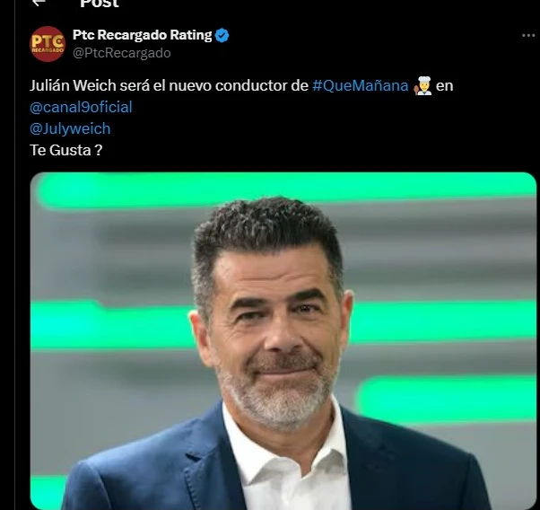 Según la cuenta de Twitter Ptc Recargado Rating, Julián Weich será el nuevo conductor de Que mañana, el magazine de cocina que antes estuvo a cargo de Mariano Peluffo. Se espera que Weich aporte algo nuevo y fresco al programa. La salida de Peluffo fue por el desacuerdo económico con El Nueve, lo que dejó el programa sin conductor.