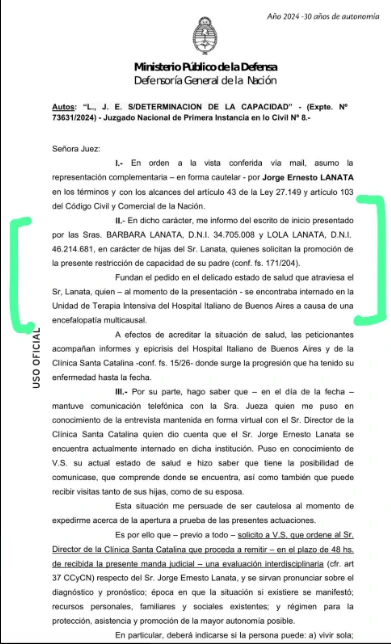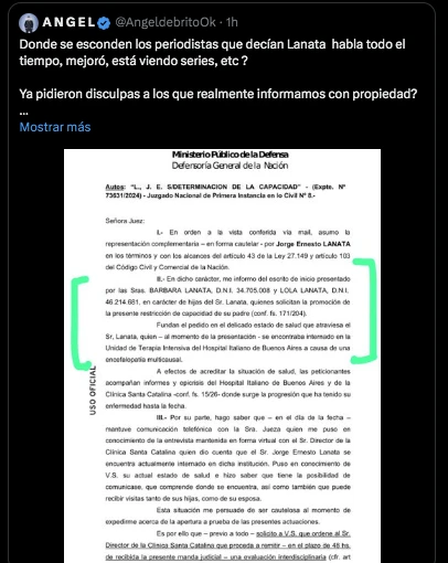 Sin embargo, Ángel acaba de conseguir una prueba irrefutable, ya que saltó a su Twitter para exhibir la documentación que ingresó el abogado de Bárbara y Lola a un juzgado. En ese papel se lee con claridad: “Las hijas de Jorge Lanata la promoción de la presente restricción de capacidad de su padre”.