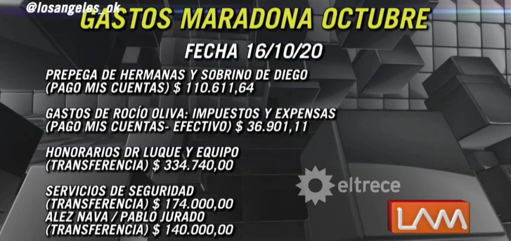 Por su parte, Maradona únicamente gastaba en sí mismo para el abono del celular, el alquiler de su casa y los impuestos correspondientes, por lo que en un total llegó a gastar 341 mil pesos y 550 mil para el alquiler. Aquel total, sumando todos los gastos de abogados, familiares y amigos, arrojó 2.409.127,36 de pesos en octubre, mientras que en noviembre fue de 2.329.559,99.