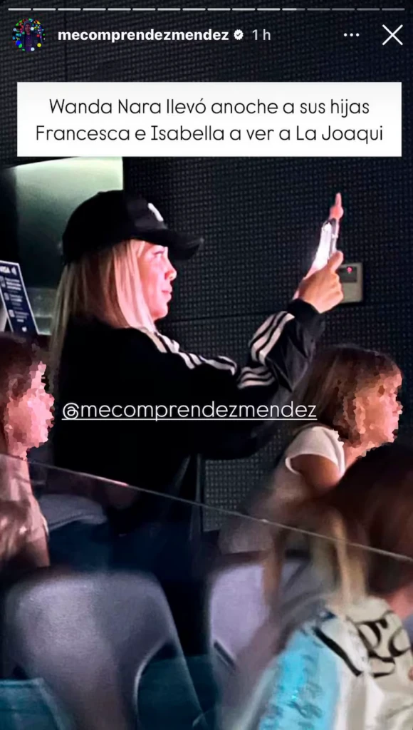 Mientras el futbolista y su acompañante fueron vistos en el aeropuerto antes de viajar a Estambul, un periodista mostró una foto de Wanda con sus hijas en el recital. “Wanda Nara las llevó anoche a ver a La Joaqui”, escribió en sus historias de Instagram, dejando en claro cómo pasó la noche.