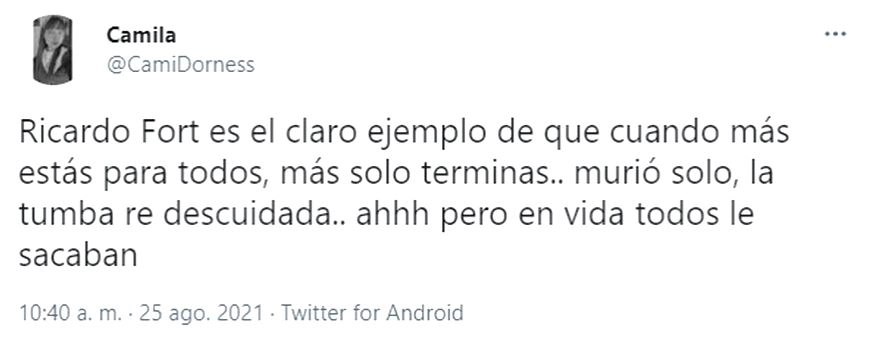 “Ricardo Fort es el claro ejemplo de que cuando más estás para todos, más solo terminás… murió solo, la tumba re descuidada… Ah, pero en vida todos le sacaban”, opinó otra persona, llena de indignación por el aparente mal estado de la tumba del artista.