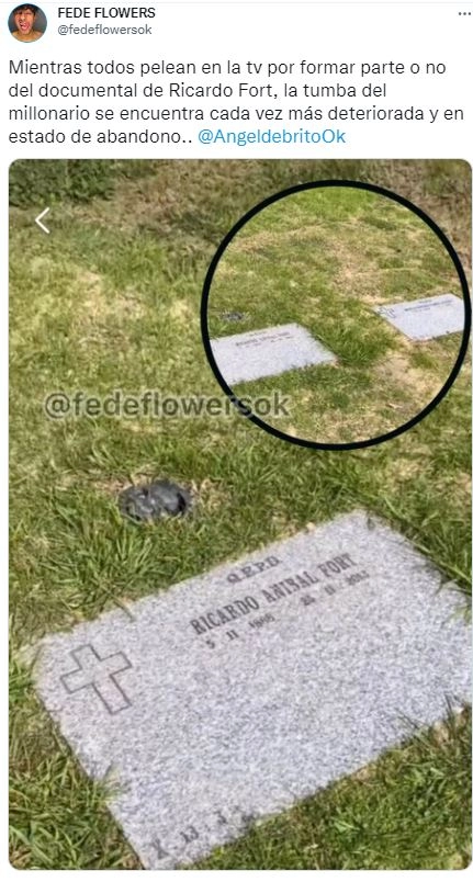 “Mientras todos pelean en la televisión por formar parte o no del documental de Ricardo Fort, la tumba del millonario se encuentra cada vez más deteriorada y en estado de abandono”, indicó un fanático de Fort en la red del pajarito.