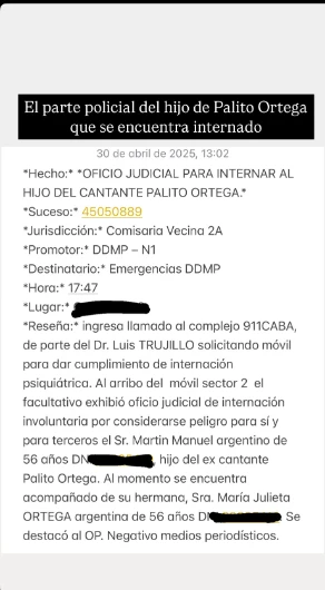 “Se recibió llamado al 911 del juez Trujillo solicitando un móvil para dar cumplimiento a la internación psiquiátrica”, arranca el texto. Hasta que llega a la frase más resonante al explicar el estado del hijo de Palito: “Al llegar al lugar se exhibió la orden judicial de internación involuntaria por considerarse un peligro para sí y para terceros el señor Martín Ortega, hijo del ex cantante Palito Ortega”.