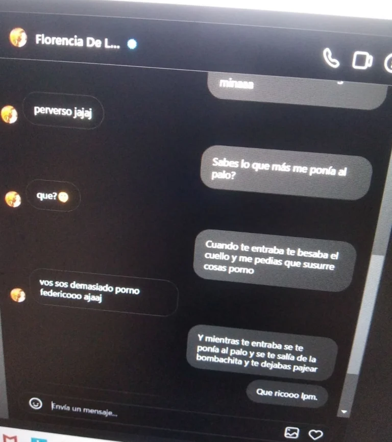 “Si pero el sexo que tuve con vos, no lo tuve nunca con ninguna mina”, remató el. Luego comenzó a recordar exactamente algunos detalles de sus encuentros íntimos con ella: “Cuando te entraba te besaba el cuello y me pedias que susurre cosas porno. Y mientras te entraba se te ponía al palo y se te salía de la bombachita y te dejabas pajear”