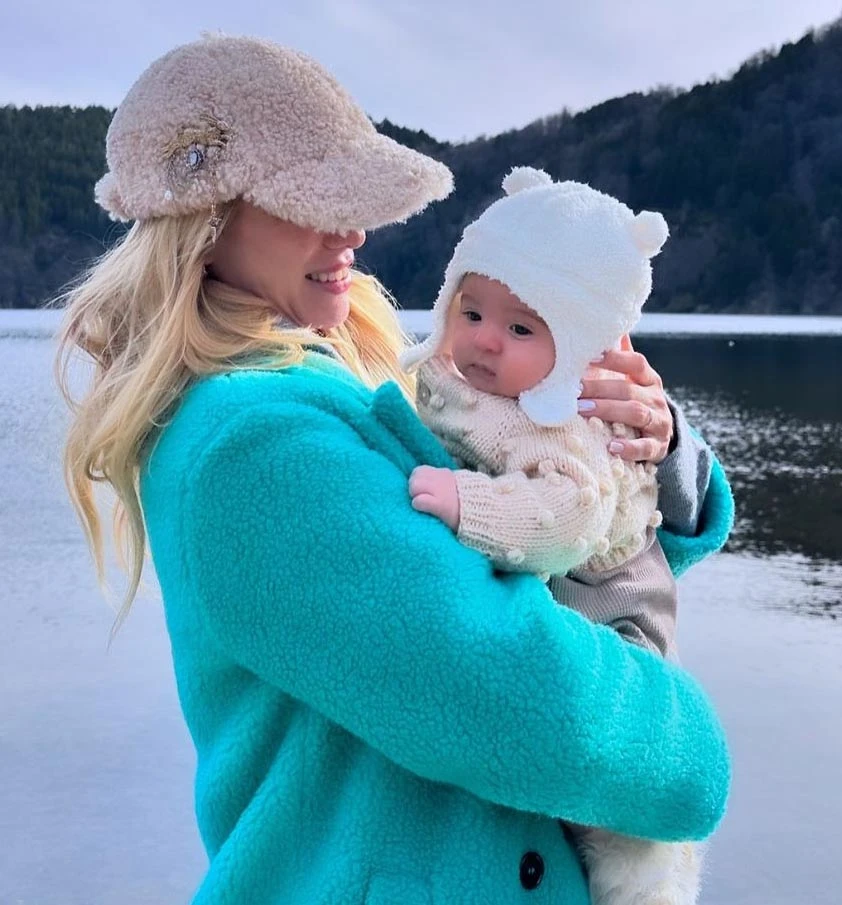 Con un hermoso lago de fondo, Nicole subió a sus stories la foto más buscada por todos: allí se la puede ver a ella con el baby en brazos, súper abrigado para enfrentar las bajas temperaturas.