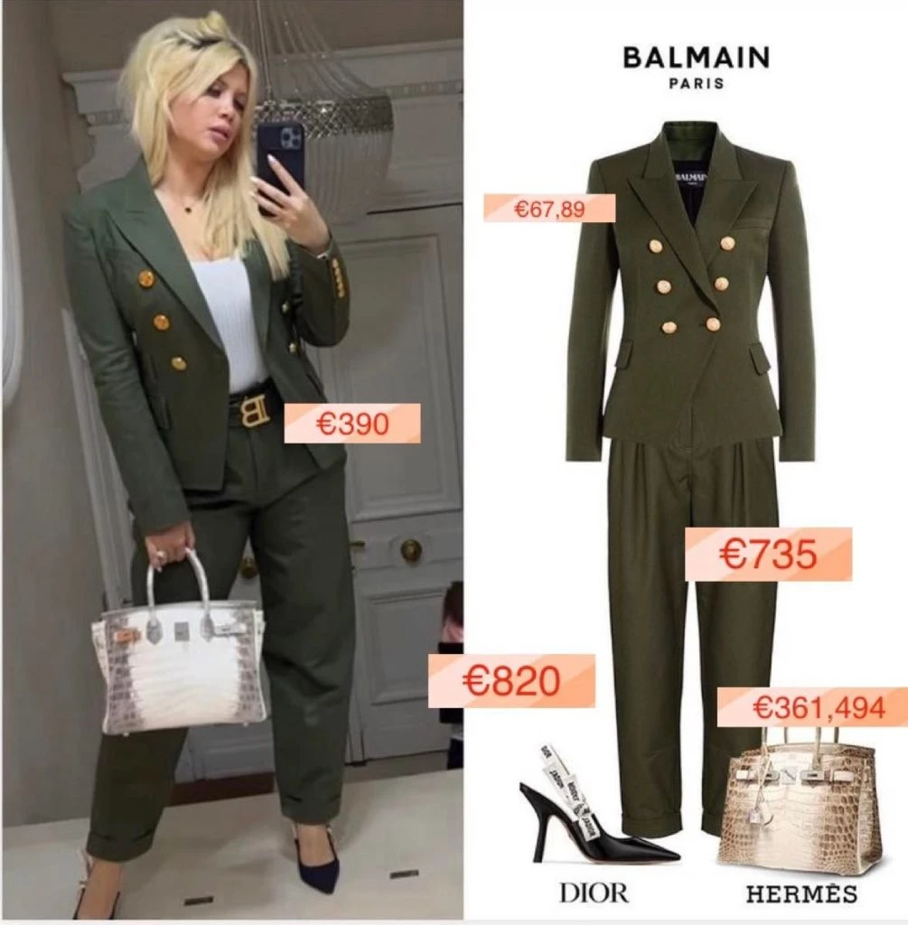 Wanda lució un traje de Balmain, zapatos Dior y bolso de mano de la línea exclusiva Himalaya de Hermés superando los 4.000 euros en su look