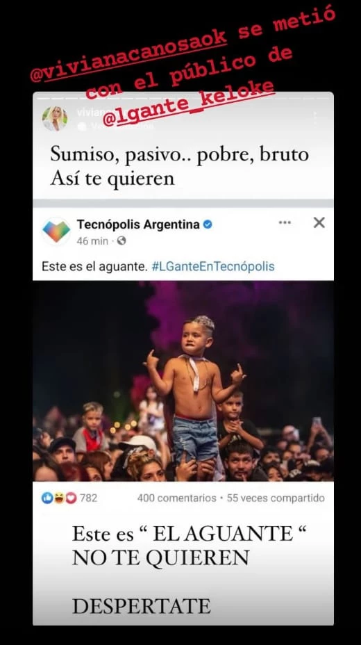 Viviana Canosa fue noticia y tendencia en las redes sociales porque compartió la fotografía de un niño que había asistido al show que L-Gante hizo en Tecnópolis y que convocó, según estimaron sus organizadores, a unas 45.000 personas. En sus redes sociales, la periodista afirmó, “Sumiso, pasivo… pobre, bruto. Así te quieren”.