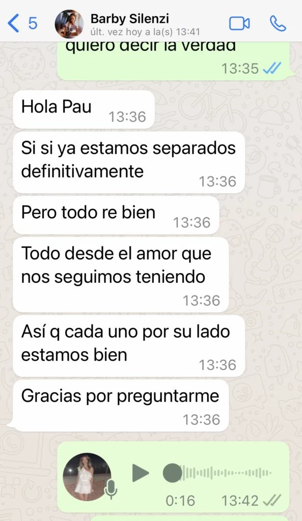 Ahora bien, parece que los famosos no lograron superar la crisis y tomaron la decisión de dar por finalizado su amor. Al menos así lo infomarn desde Socios del Espectáculo cuando Barby respondió: "Sí. Ya estamos separados definitivamente. Pero todo re bien".