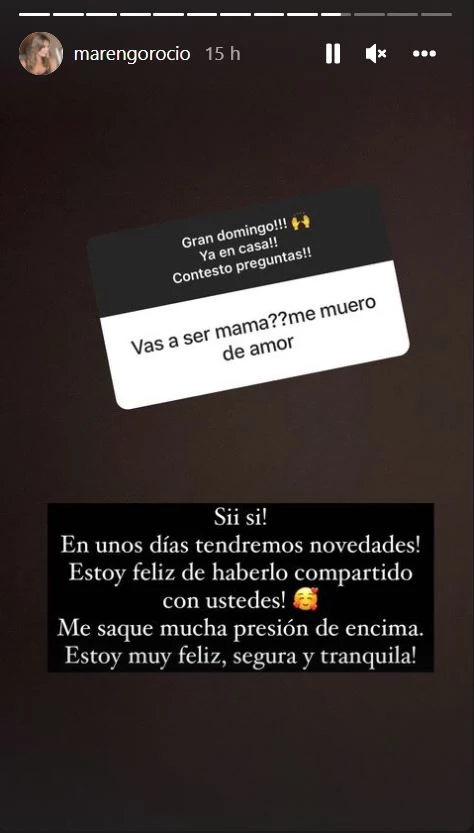 “¿Vas a ser mamá? Me muero de amor”, le comentaron. A lo que ella contestó: “¡Sí, sí! ¡En unos días tendremos novedades! ¡Estoy feliz de haberlo compartido con ustedes! Me saqué mucha presión de encima. ¡Estoy muy feliz y tranquila!", aseguró. Ampliaremos.