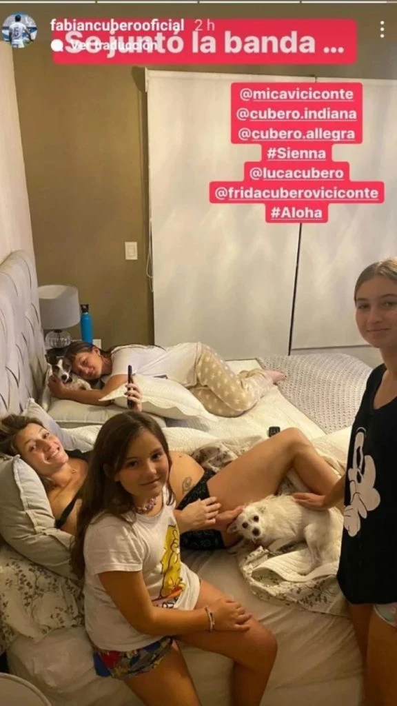 Esta vez, en la postal se observa a Mica recostada en la cama junto a sus tres hijastras, Indiana, Alegra y Sienna y a sus dos mascotas. Las pequeñas se muestran alegres y ansiosas ante la llegada del primer varón a la familia y acompañan a Mica en este desafío.