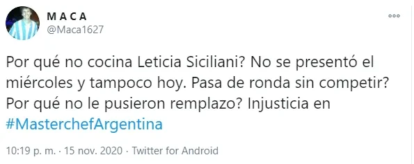 Masterchef Celebrity se convirtió en el programa más visto por los argentinos. El reality que buscar al mejor cocinero famoso amateur ha cosechado miles de fanáticos. Esta semana Leticia Siciliani no se presentó al programa ni miércoles ni jueves así como tampoco estuvo en la gala de eliminación.